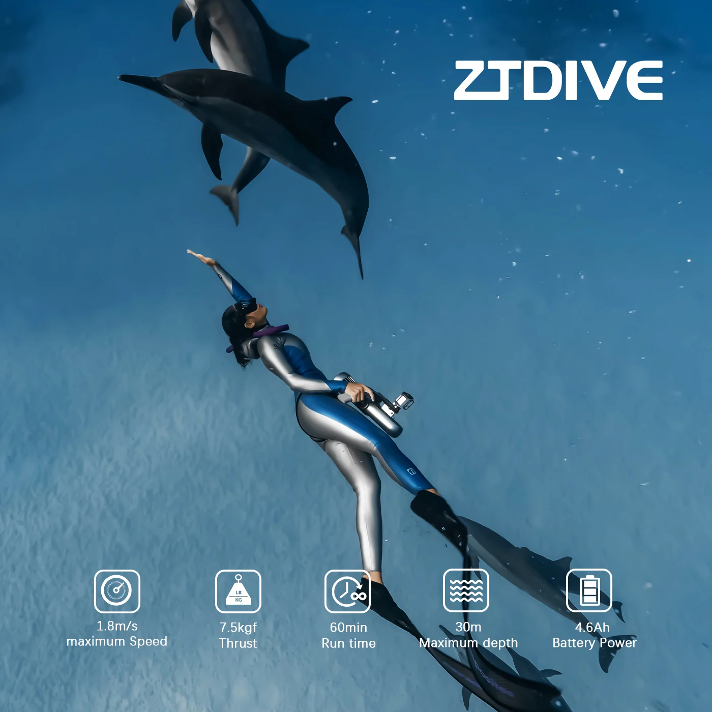 The ZTDive Jetdive is depth-rated to 30 metres, making it suitable for recreational snorkelling, freediving, and shallow scuba diving. It should not be used beyond this depth rating.
